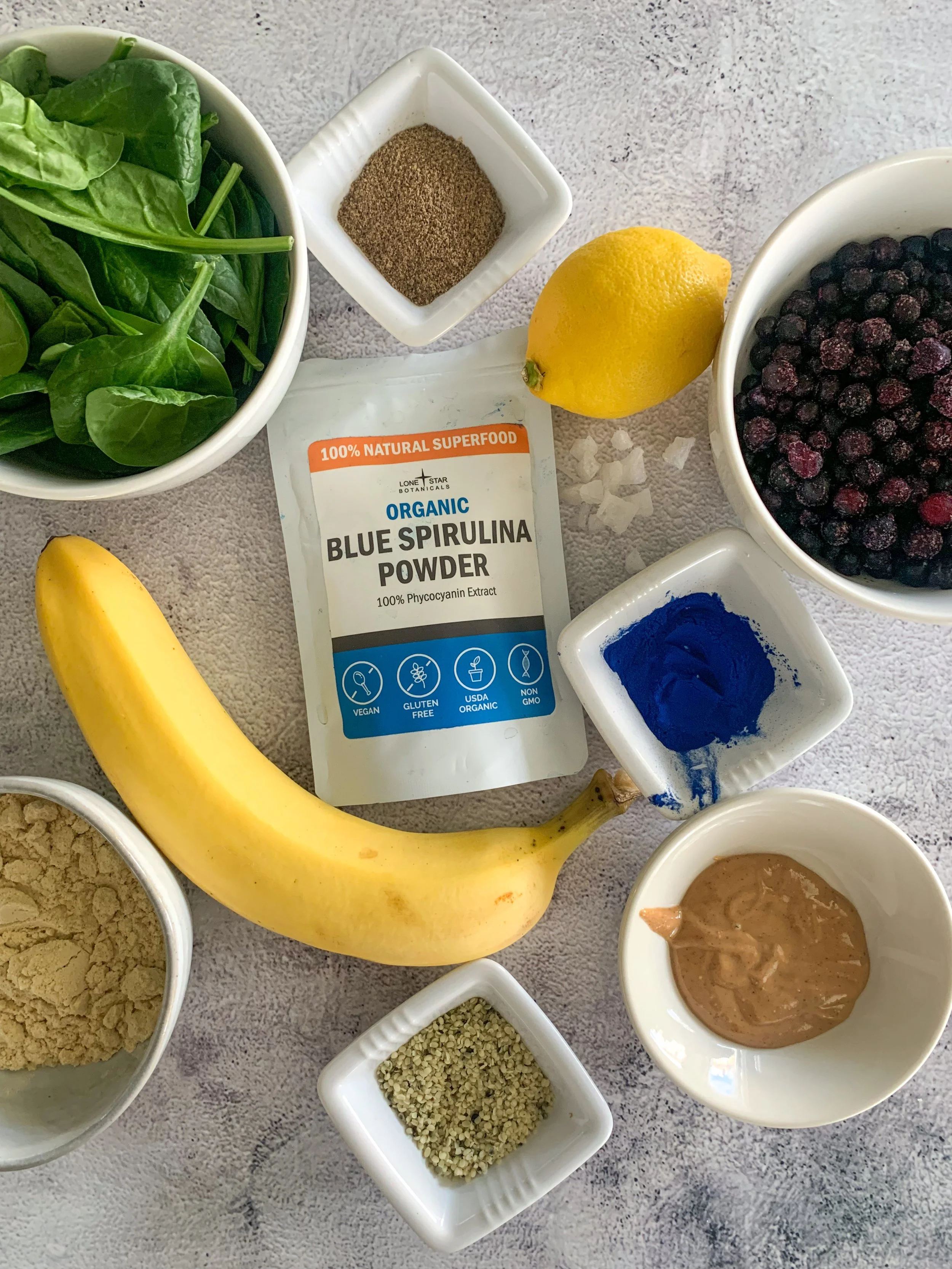 Place spinach into the blender first, then cover with the rest of the ingredients;