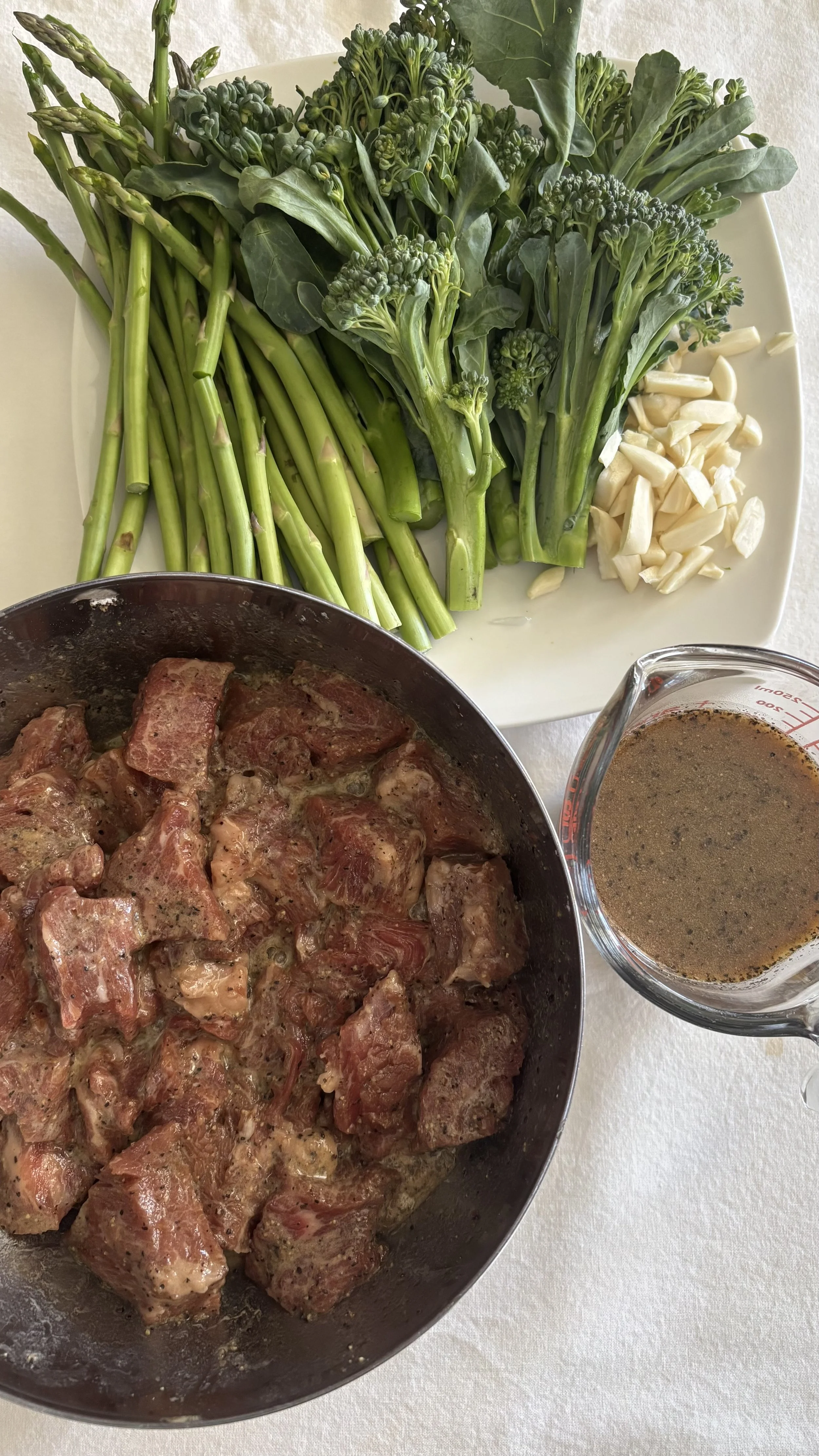 In a bowl, whisk together all the marinade ingredients. Add the beef and toss to coat. Marinate for about 15 minutes while you prep the vegetables and sauce.