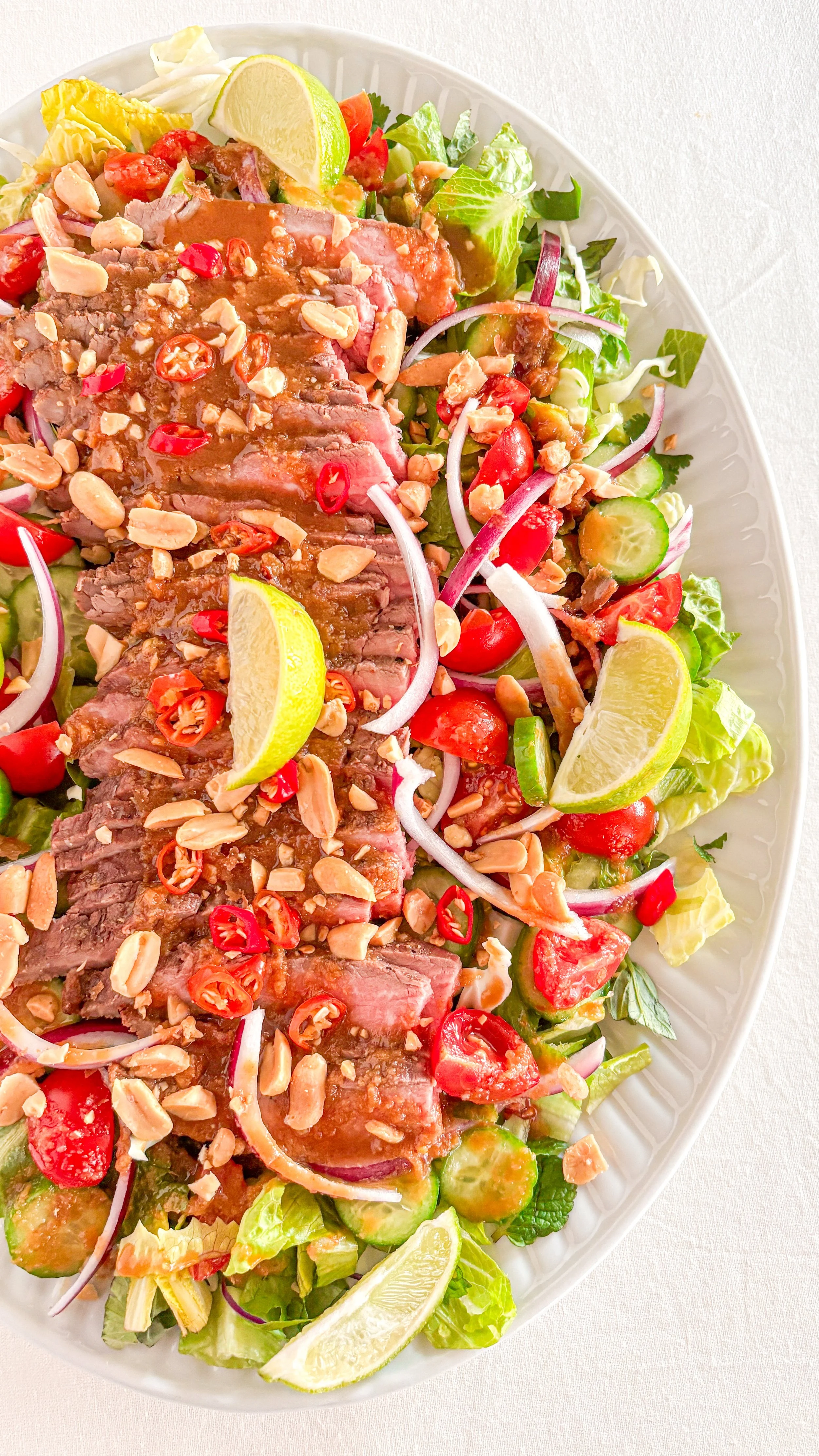 Serve Add 150–200 g of sliced steak over a generous portion of salad. Drizzle with the peanut-lime dressing as desired and finish with an extra squeeze of fresh lime. Add the peanuts at the end for crunch.